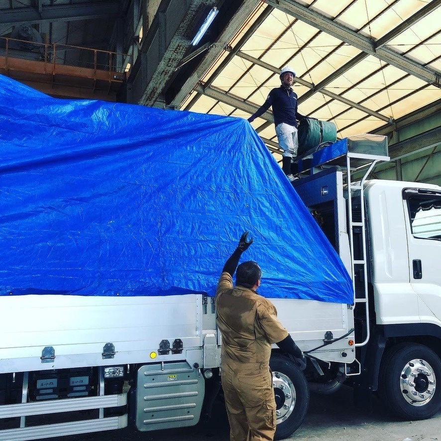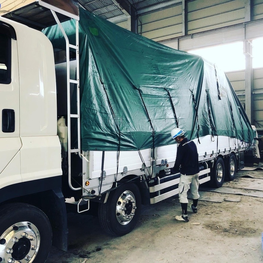 2月にお預かりさせて頂いた機械の出荷をさせて頂きました。背高貨物のため、メーター低床車にて出荷させて頂いております。シートをクレーンで吊り上げ、3人で位置調整し1時間ほどかかりました。大型貨物のシートがけはとても大変です。