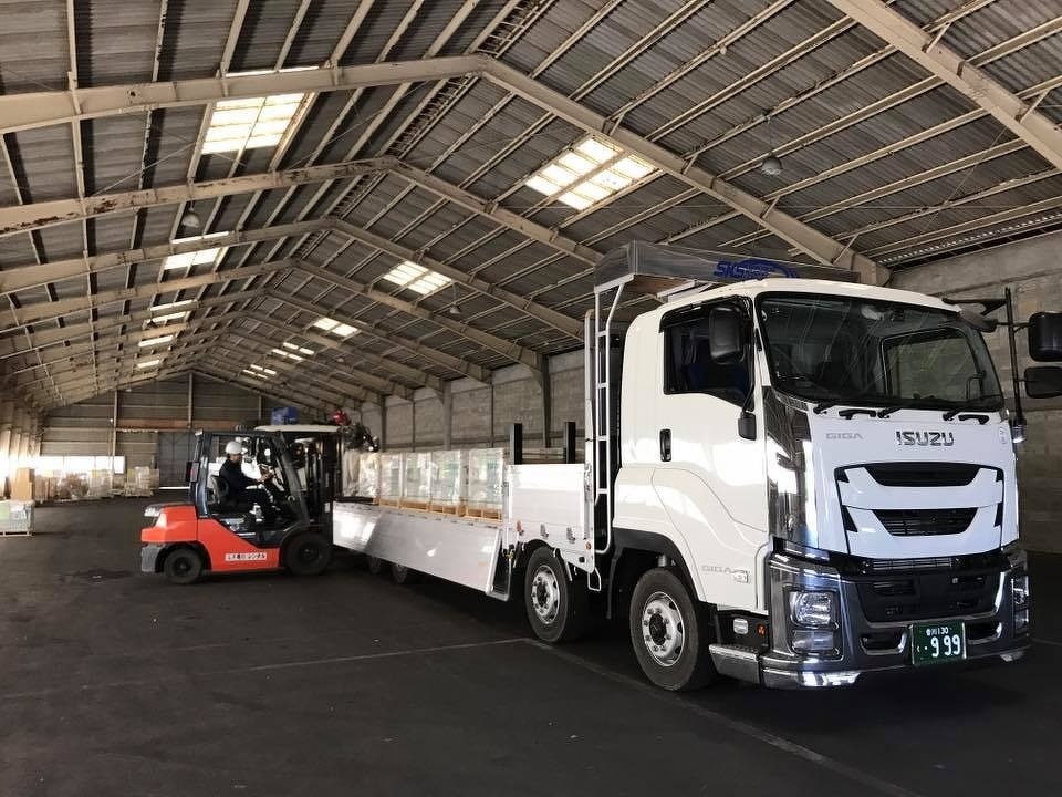 いつも弊社のFBをご覧頂きありがとうございます!本日はタイル31tを改装中のショッピングモールへ深夜の納品です。現場にリフトが無いので弊社の大型2台と7tユニックで荷降ろし納品させて頂きました。荷降ろしでお困りの時はぜひ坂出キョードーにお声掛けください。