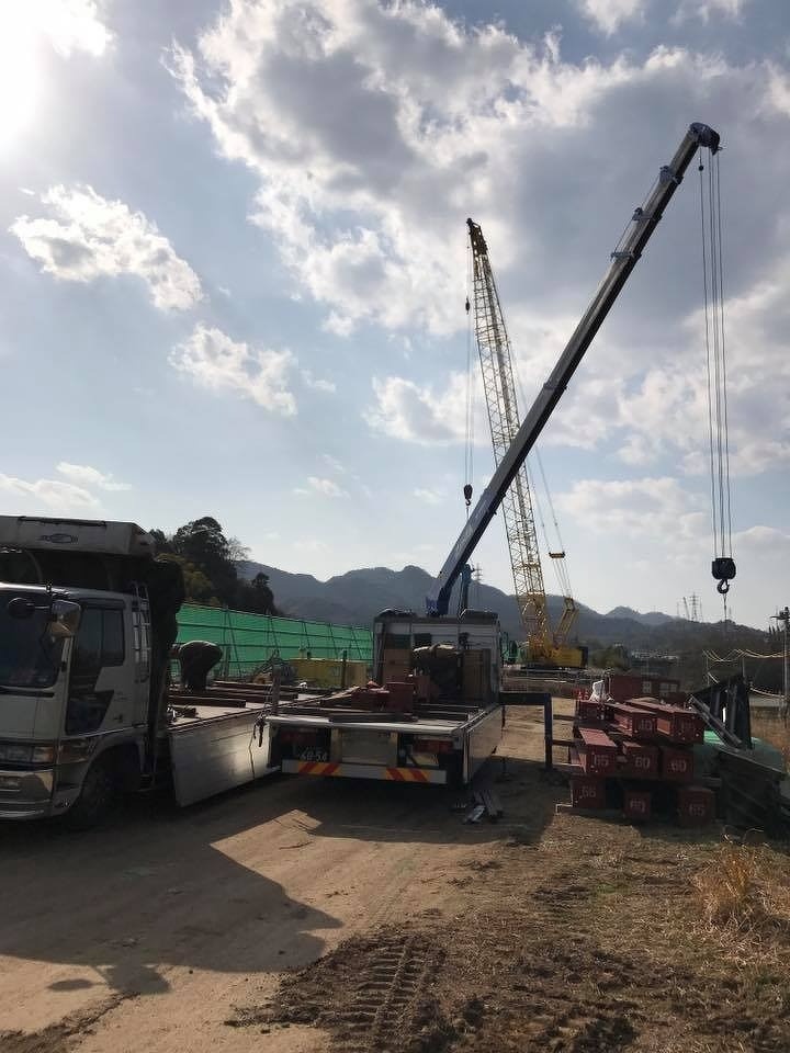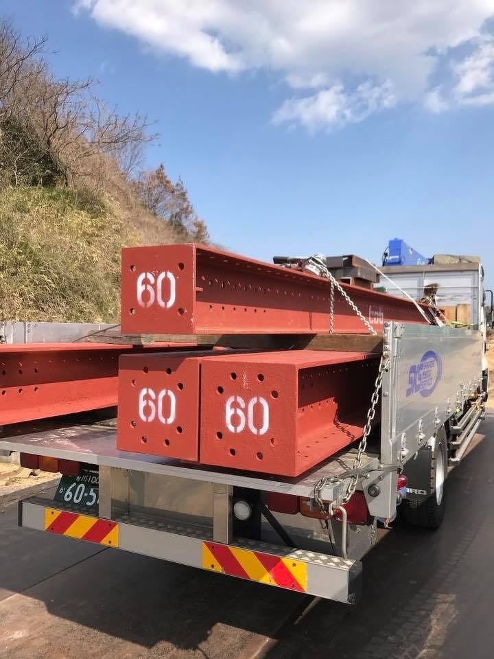 本日は道路建築現場に仮設資材の緊急配送をさせていただきました。大型ユニックが手配できないとの事でかわりに7tユニックと4t車にて対応させて頂きました。