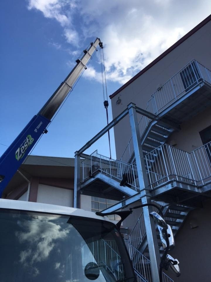 本日は倉庫建築現場へ階段手すり配送からの取り付け作業です。3階までの手すり取り付け作業を