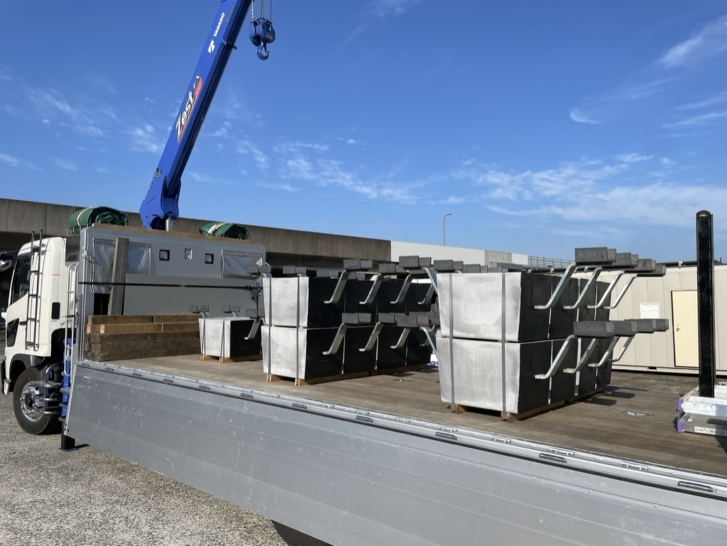 インゴットの荷受け、クレーン付き車輌で現場への輸送